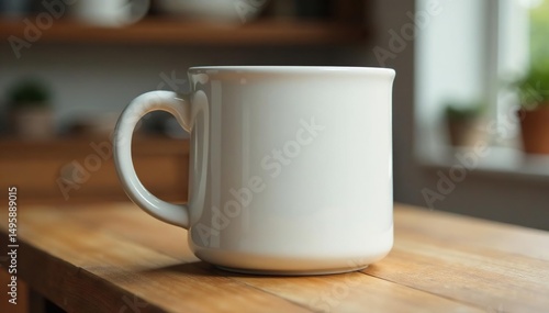 © Merisa, Fototapeta premium Large ceramic mug, thick handle, pristine white, home decor, drink, stoneware
