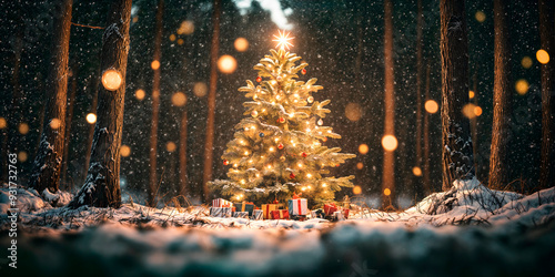 Naklejka premium Large Christmas tree lit up with fairy lights and wrapped gifts at the base in a pine forest covered in snow