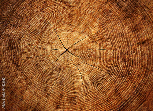© CaptureAndCompose, Naklejka premium Large closeup of aged tree ring surface. Warm orange and yellow tones with rings and cracks.