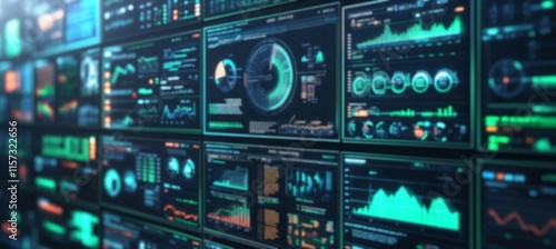 Fototapeta premium Large collection multiple computer screens various graphs charts Financial analytics dashboard