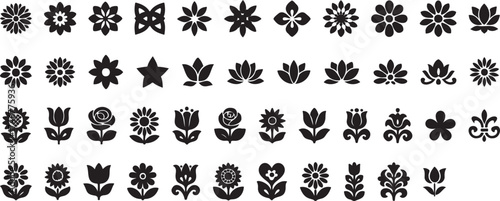 © Faija, Fototapeta premium Large collection of various black flower and floral motif icons isolated on transparent background, featuring different shapes and styles