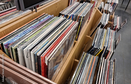 © Tomasz, Obraz premium Large collection of vinyl records displayed in wooden bins, diverse popular music album selection at a music store, shop, supermarket. Musical albums pressed on vinyl, fresh releases, buying selling
