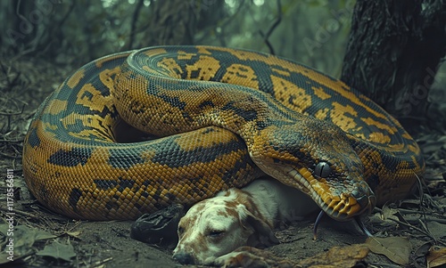 © ANUAR, Fototapeta premium Large Colorful Snake Coils Comfortably Around Sleeping Dog in Serene Forest Environment, Capturing a Unique Moment of Nature's Intriguing Dynamics and Wildlife Interaction