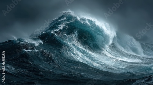 © Suryadil, Fototapeta premium Large crashing wave in open sea. Background shows stormy weather; for coastal threat