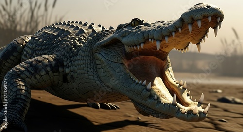 Fototapeta premium Large crocodile with open mouth showing teeth a dangerous predator in its...