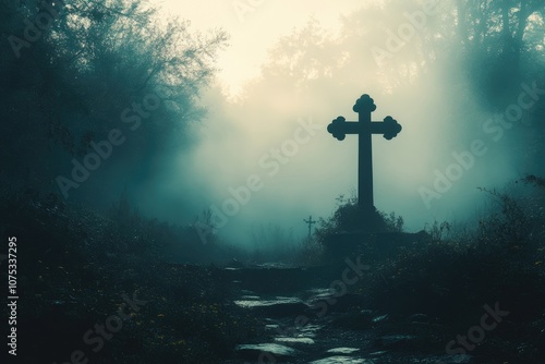© Gatherina, Naklejka premium Large cross standing in a foggy forest at dawn