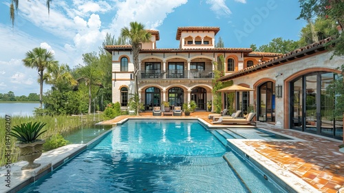 © piumi, Fototapeta premium Large custom home on the water with pool