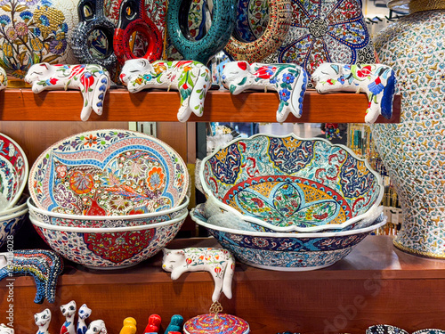 Fototapeta premium Large decorative bowls with traditional patterns displayed in a market stall....