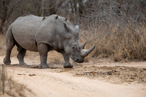 © Darrel, Obraz premium Large Dominant white rhino bull scent marking at a large dung midden