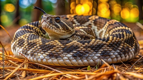 © yuwaree, Fototapeta premium Large Eastern Diamondback rattlesnake in pine needles