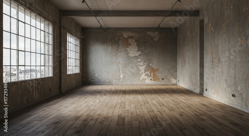 Fototapeta premium Large empty loft space, industrial interior, wooden floors, exposed concrete ceiling, multiple tall windows, natural light, spacious, urban warehouse, minimalist, rustic, open floor plan, sunlit room,