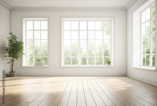© daniy, Obraz premium Large empty spacious bright white loft room with parquet