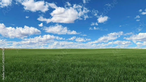 Obraz premium Large expanses of green meadows stretch under a white cloud-covered blue sky,...