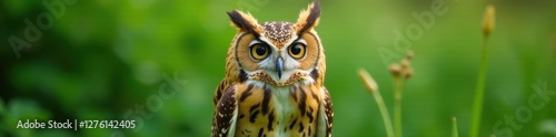 © Theerawat, Fototapeta premium Large-eyed owl, striking pose, soft green background, woods, detail