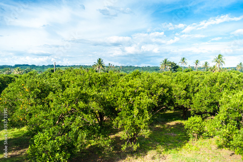 © Leocomic, Naklejka premium Large fields of orange plants, orange harvest