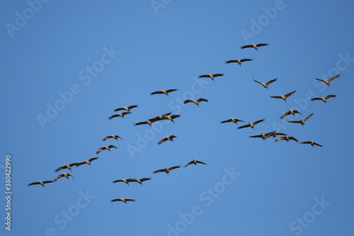 © rima15, Fototapeta premium Large flock of Cranes in flight on a blue sky.