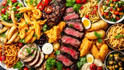 © ImagineInfinite, Fototapeta premium Large Food Platter: Steak, Pasta, Fried