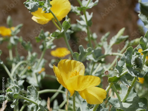 Naklejka premium Large fragrant yellow flowers of horned poppy on a sunny spring day. Herbal...