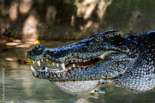 Fototapeta premium Large freshwater crocodile head lying in a pond, a farm in Thailand