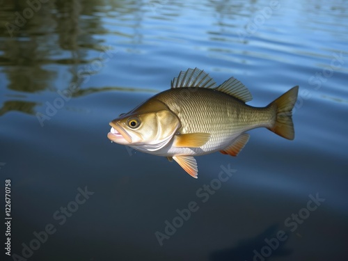 Fototapeta premium Large freshwater perch swimming near the surface of a lake on a sunny day, fishing adventure, fish swimming