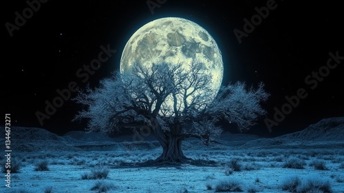 Naklejka premium Large full moon behind a barren tree in a desolate landscape at night.