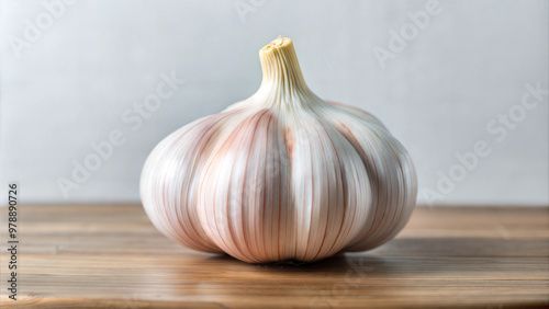 © Lidiya, Obraz premium Large garlic bulb on a wooden table with a rustic background