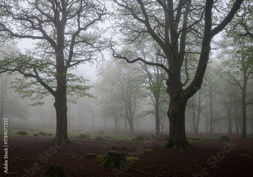 © unlimited, Obraz premium Large, gnarled trees stand prominently within a dense, misty forest landscape