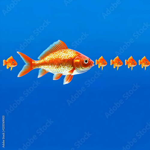 © Siasart Stock, Fototapeta premium Large Goldfish Leads a Group of Smaller Goldfish in a Blue Background