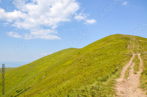 Fototapeta premium Large grassy meadow, slopes and forested hillsides of Carpathians. golden...
