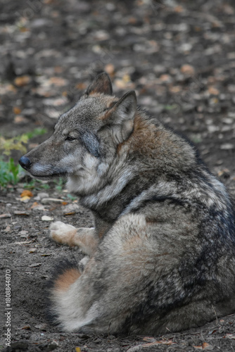 © lisica1, Fototapeta premium Large gray wolf resting in a dug earth hollow