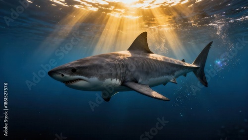 Fototapeta premium Large Great White Shark swimming underwater, illuminated by powerful golden sunlight rays piercing the deep blue ocean surface.