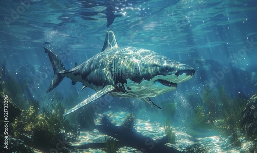 Fototapeta premium Large great white shark swimming underwater in ocean.
