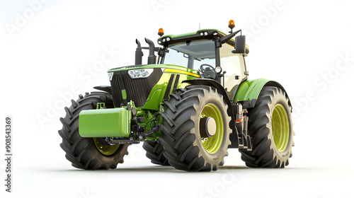 Obraz premium Large green agricultural tractor with powerful engine working on cultivated...