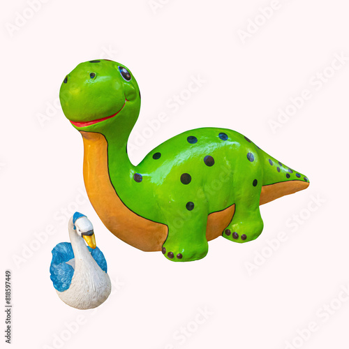 © wutipong, Naklejka premium " large green dinosaur toy adorned with blue spots and an orange underbelly. friendly expression, featuring big eyes and a wide smile. Beside the dinosaur, we see a smaller white swan figure with blu