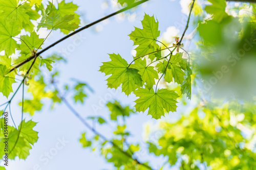 Fototapeta premium large green leaves on tree branches, view from below, selective focus, blurry background