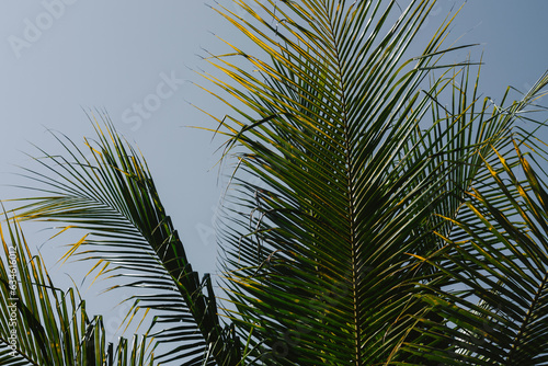 Fototapeta premium Large green textured palm leaves bottom view. natural background with space...