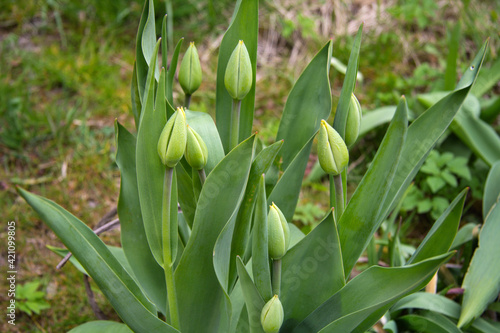 © Natalya, Obraz premium Large green tulip buds spring in the garden