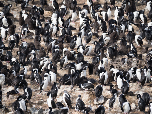 Fototapeta premium Large Group of Blue Eyed Cormorants in a colony with adult birds and fluffy black chicks.