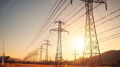 Fototapeta premium Large group of high voltage electric poles at sunset, natural light