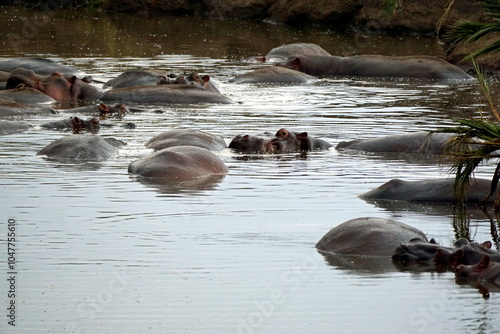 © chriss73, Fototapeta premium large group of hippos at a pond