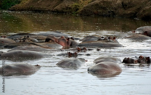 © chriss73, Fototapeta premium large group of hippos at a pond