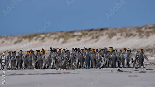 Obraz premium Large group of King Penguins (Aptenodytes patagonicus) and a few Magellanic Penguins (Spheniscus magellanicus) on a sandy beach at Volunteer Point in the Falkland Islands.
