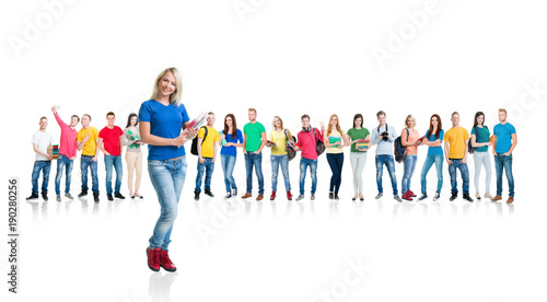 © Acronym, Fototapeta premium Large group of teenage students isolated on white background. Many different people standing together. School, education, college, university concept.