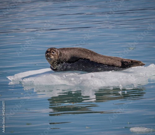 Obraz premium Large harbor seal rests on a chunk of floating ice.