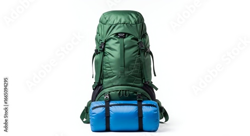 © Photqeey, Naklejka premium Large hiking backpack with rolled-up sleeping bag attached, clean background