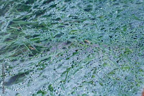 Obraz premium large horizontal photo. summer time. green grass covered with glass after...