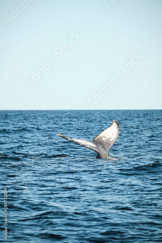 Fototapeta premium Large humpback whale splashing and slapping tail during whale season Australia