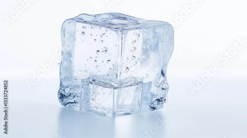 © HecoPhoto, Obraz premium Large Ice Cube with Air Bubbles Melting Closeup