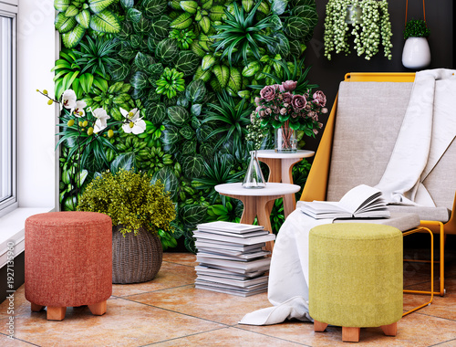 Fototapeta premium Large illustration 3D rendering luxury modern bright interiors Living room...