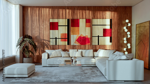 © 3DarcaStudio, Fototapeta premium Large illustration 3D rendering luxury modern bright interiors Living room mockup with Couch and Ceiling Fan Ventilation
